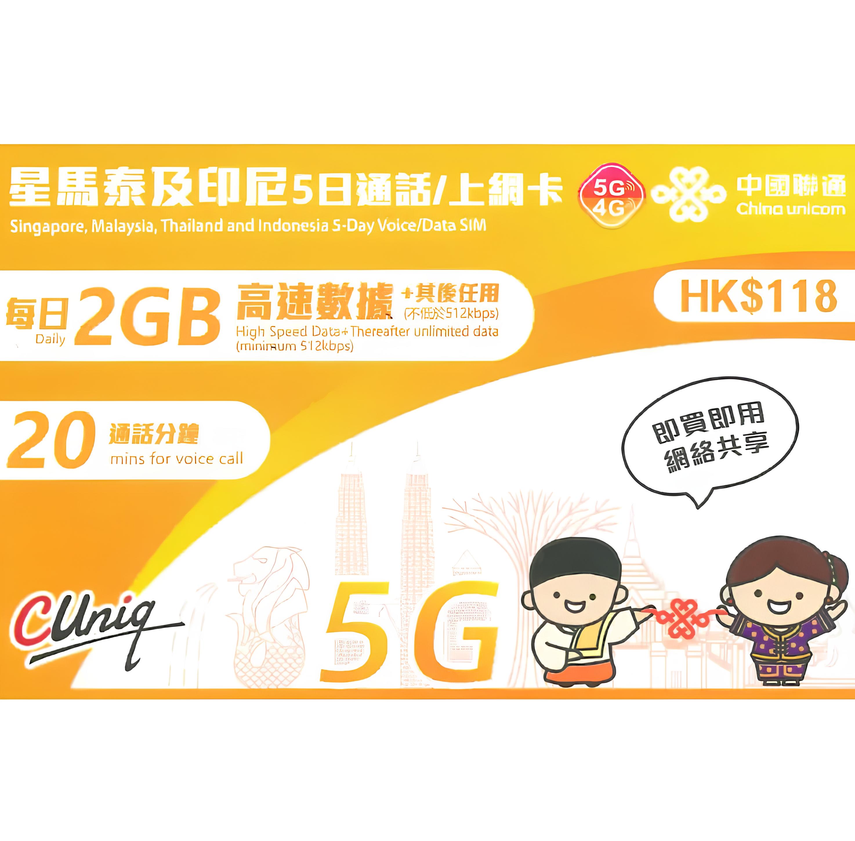 中國聯通「星馬泰及印尼5/8/15日通話/上網卡(Daily 2GB FUP)」